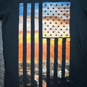 USA flag and NYC skyline graphic T-shirt. Comfortable streetwear. No pets/smoke.