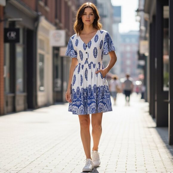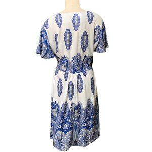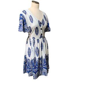 The Reborn Dress in White and Blue Floral is a plus-size 1X dress with a button front and short sleeves. Made from polyester spandex knit fabric, this knee-length dress features a V-neckline and flutter sleeves. The dress has a contemporary modern mod style with a fit & flare design, perfect for casual occasions like beach coastal outings, backyard BBQs, or garden gatherings. With a floral and paisley pattern, this lightweight and stretchy dress is machine washable and ideal for the summer and spring seasons.