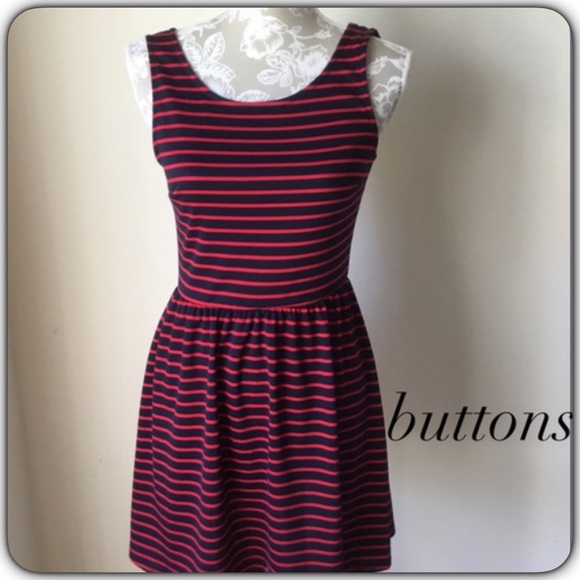 Very nice sleeveless red and black striped dress with cutouts in the back and small bows. Elastic waist. Polyester/Spandex.