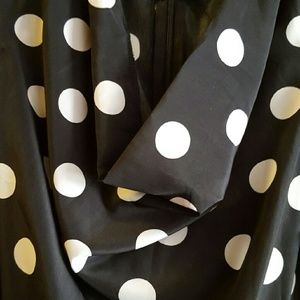 New short sleeves, white polka-dot on black background, cow neck dip, Red bottom to the knee.