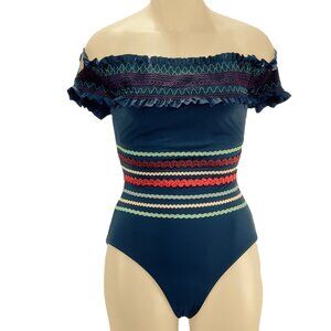 This RED CARTER women's swimsuit, in a contemporary fit, is perfect for the active swimmer. The In Stitches style, off-the-shoulder design is smocked and embroidered, featuring ricrac lining. Made of nylon spandex, it comes in a vibrant blue color and is a size 6.
