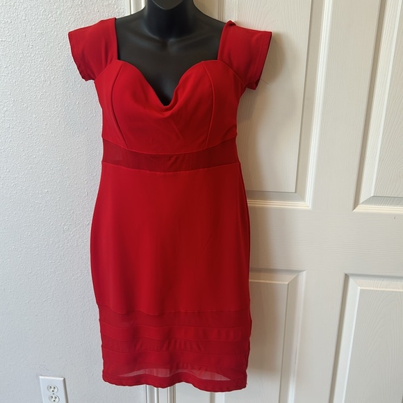 Red off the shoulder dress with mesh throughout. Gold zip up back. Size large