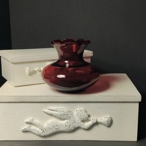 It is a Beautiful Cranberry, Ruffled Edge 3 1/4" tall. This vase is in perfect condition No chips cracks discoloration or repairs! PLEASE see all pictures for measurements and condition. No Markings, in the style of a Anchor Hockings.