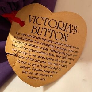 RED HAT SOCIETY Victoria’s Button Handmade Doll Red Purple. This is preowned. But in very good condition. The button on the back of the doll gives her name and her number. Her name is Rose and the number is 1120
