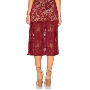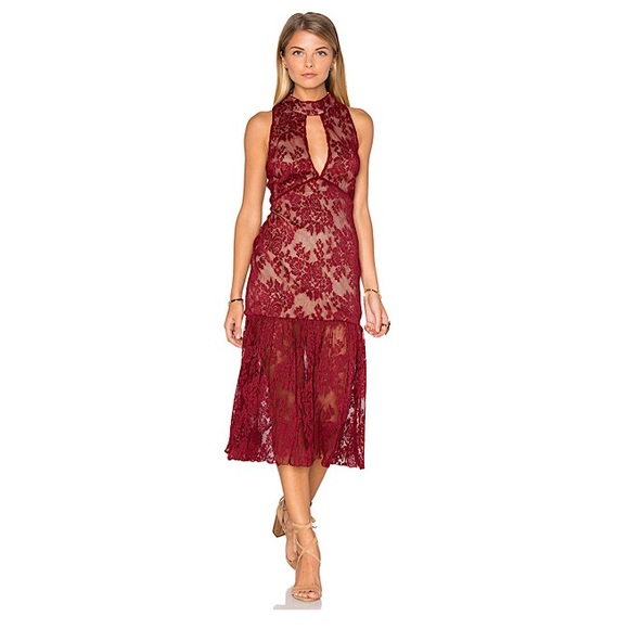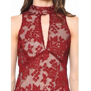 NWT Endless Rose lace midi dress. Color: burgundy; sleeveless; midi length; high keyhole neckline; flared hem; lace overlay fabric; hidden back zipper closure; partially lined; nylon blend. Measurements: approx 48” length. Size S- true to size.