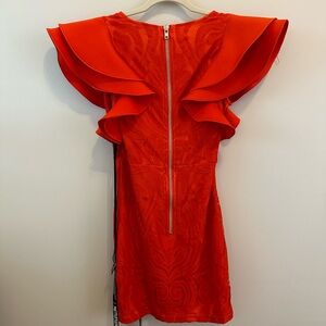 RED LACE RUFFLE DETAIL PLUNGE BODYCON DRESS