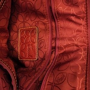 This is a large bag by Fossil. It has pockets inside and a place for a tablet or laptop.