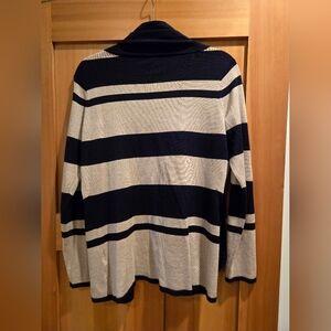 Chic navy and tan stripes. Open front design w cowl collar. Ideal for layering.