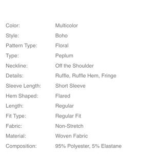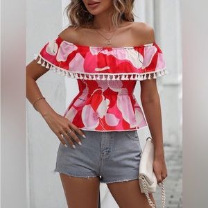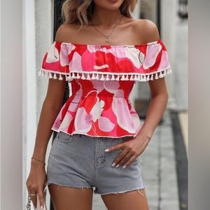 RED OFF SHOULDER RUFFLE TOP is FEMININE & FLIRTY! THE DESIGN & PRINT IS AMAZING & THE COLORS ARE VIBRANT & BOLD’! SIZE: S & M