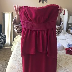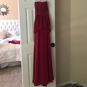 This gown is gorgeous! I wore it once. It's a peplum style dress with a tie around at the waist to accentuate the waist even more! Strapless. Pretty much new condition.