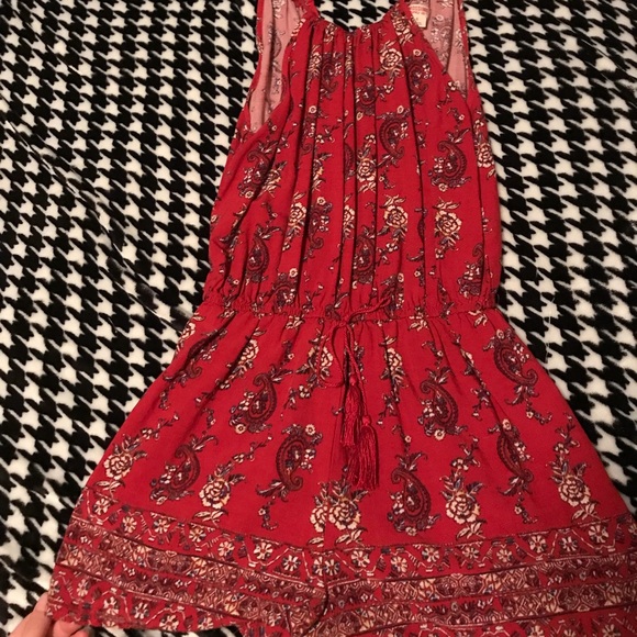 Deep red, spaghetti strap romper. Light and breathable, not super short