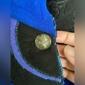 Embroidered details, carved accents in the front shoulder black fleece and statement buttons. Large front pockets. Excellent condition. Only flaw is size tag is cut out. It is a 1X and fits generously