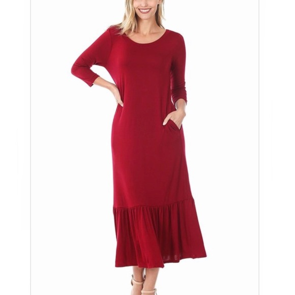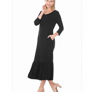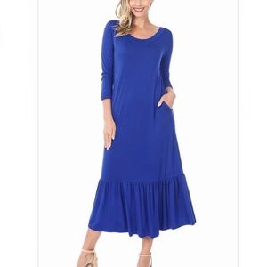 3/4 SLEEVE ROUND NECK RUFFLE HEM LONG DRESS WITH SIDE POCKETS