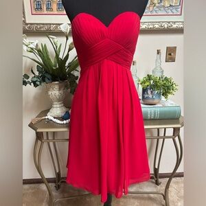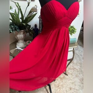 This stunning strapless dress features a vibrant red hue, perfect for any special occasion, homecoming, prom, wedding guest, cocktail, bridal, pageant, holiday etc. The elegant design offers a flattering fit, making it a must-have addition to your wardrobe, featuring a hidden back zip , built in padded bra, boning for a good no slip fit, hidden back snap panel, fully lined . Just a beautiful elegant red dress ! Measurements 16.5” ptp, 31” length
