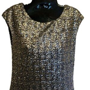 Glamorous RED by Saks Fifth Avenue sequin sheath dress in a striking gold and silver combo. Features a classic scoop neckline, cap sleeves, and a deep V back with exposed zipper detail. Fully lined with light stretch for comfort. A perfect statement piece for any party or formal occasion.