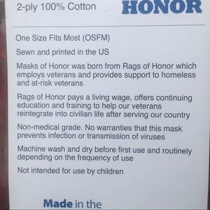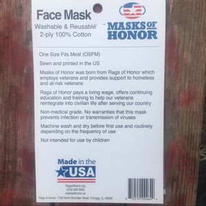 New New in sealed packaging Masks of Honor Face mask for the American patriot! Red with black trim Reads in white lettering: USA Washable Reusable 2 ply 100% cotton Non medical grade One size fits most Made in the USA! Made by Rags of Honor which employs American veterans to produce these and other items