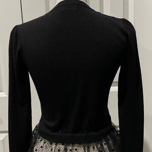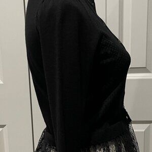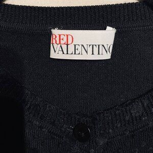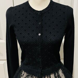 RED VALENTINO BLACK SWISS DOT AND LACE PEPLUM CARDIGAN - SIZE 4- black puffed sleeves, front button front closure, dot lace detail, ruffled lace peplum bottom, crew neckline, long sleeves, Wool and Poly combo fabric, size 4- missing fabric and size tag (I know it is a size 4) Shoulders 15", Bust 32", Sleeves 23", Length 22" - Excellent Condition