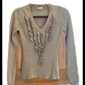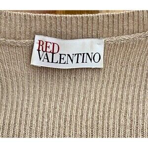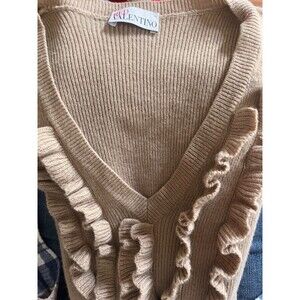 Red Valentino Beige Merino Wool ruffle front v neck sweater