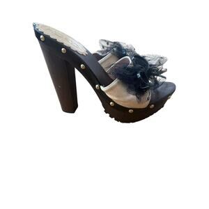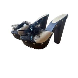 RED Valentino Garavani Wood, Leather, Mesh, Lace, stiletto mules black tan gold