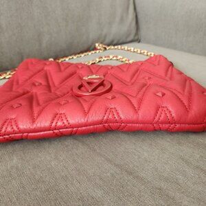 Red Valentino shoulder bag, almost new Excellent condition, see pics, gold color chain strap. Chevron quilting is dotted with stud details on this red Italian leather satchel. 8.5"H x 12.5"W x 6"D; 15" handle drop Dual partial chain straps Magnetic top closure Exterior features chevron quilting and stud details Interior features 2 compartments and 2 zip pockets Leather exterior