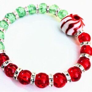 RED and Green Rhinestone Christmas Glass Peppermint Candy Bracelet