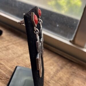Red and silver etched cross western style earrings. Approximately 2” dangle post earrings, see pictures for details.