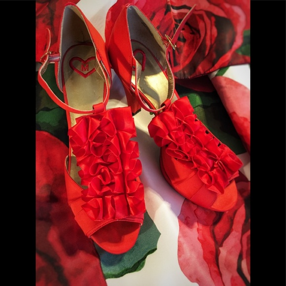 NWOT Madeline Red đź‘ RUFFLE TUXEDO platform open toe SANDAL