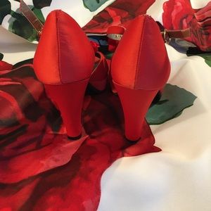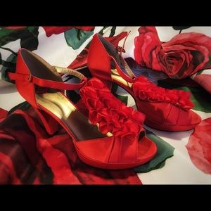 The teasing femininity of a red satin ruffle front arch with a small platform, just the right size heel (3 1/4”) and ankle strap for a finely articulated take on playful sensuality.