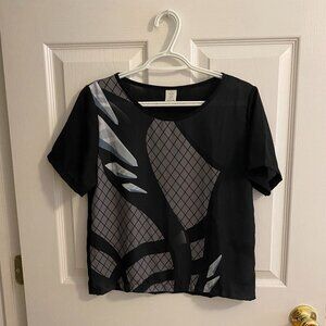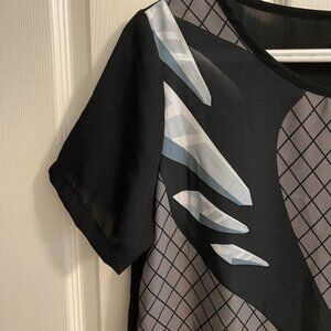 Short sleeve dark gray/black top with light highlights. Pattern is based on Yuuri Katsuki's outfit from anime "Yuri on Ice". Lightly translucent, so need to wear a layer underneath.