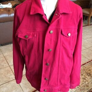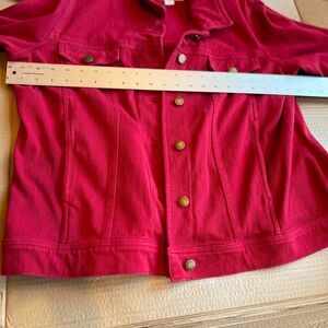 A classic red denim jacket like this adds that extra style to so many outfits including adding it over neutrals! It’s never been worn but it has been washed once.