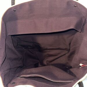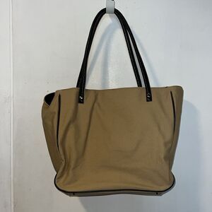 Khaki colored canvas exterior with dark brown faux leather round handles, trim and piping, silver hardware feet on the bottom, dark brown canvas lining with one zipper pocket and three slip pockets to put pictures in that can be visible from the outside. Excellent condition. Measures 14”W x 12”H x 7”D with a 10” strap drop.