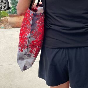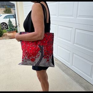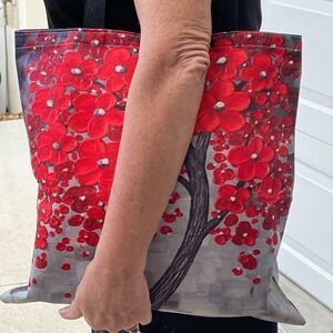 This gorgeous polyester tote is like carrying around a piece of art. Open tote, unlined. Design on both sides.