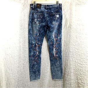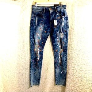 Blue semi-acid wash skinny jeans with a multi-colored paint splatter design. It's new with tags. Please refer to pictures for best description and condition verification.