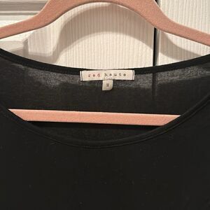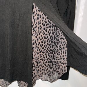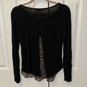 GREAT CONDITION! Black with Sheer Brown + Black Leopard Print Detailing on Trim. Round Neckline. Sheer Layered Detailing on Back. Super Soft! Stretchy Material.
