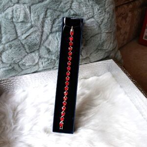 This bracelet features a series of heart-shaped links that are intricately intertwined, each adorned with shiny, bright ... RED rhinestones.