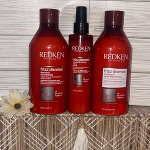 REDKEN Frizz Dismiss Shampoo, Conditioner & Smooth force leave in spray