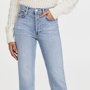 The Re Done jeans feature a light, 90s vintage inspired faded wash and a '70s-inspired stove pipe silhouette. A great throwback style!
