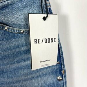RE/DONE 70s Straight Moon Stoned Stud Jeans. Classic High Rise with full length inseam. Studded detail. Zipper fly. Rigid denim. Wash: Moon Stoned Stud. Brand new with tags. Size 26 and 30.