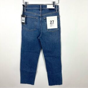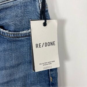 RE/DONE 70s Ultra High Rise Stove Pipe. Straight leg Jeans. Cropped inseam. Distressed detail. Wash: Vintage Indigo Destroy. Button fly. Comfort stretch. Brand new with tags. Size 27.