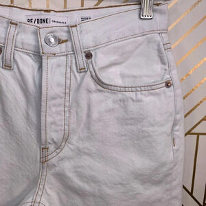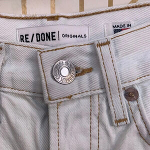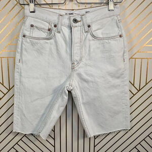 Brand new with tags RE/DONE 80'S Long Denim Shorts in Bleach White. Bleached 80's style long shorts in authentic denim. Belt loops. Bronze contrast topstitching. Button fly. Five pocket styling. Frayed hems. Silver-tone and copper-tone hardware. In white.