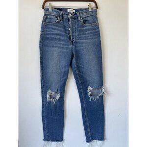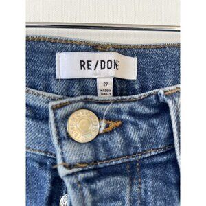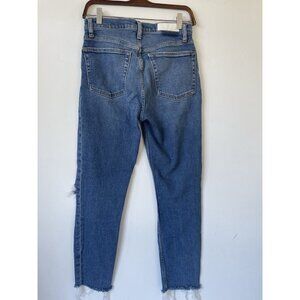Keywords: RE/DONE jeans, 90s high rise denim, ankle crop jeans, distressed jeans, frayed hem, light wash jeans, designer denim size 27