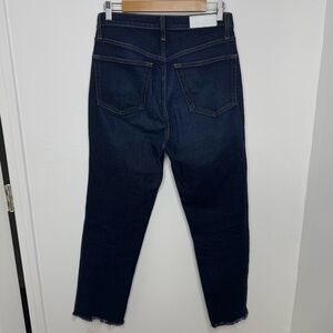 Re/Done Dark Wash Stovepipe Jeans with a Raw Hem. Button Fly. Excellent Condition. No Flaws. Size 28
