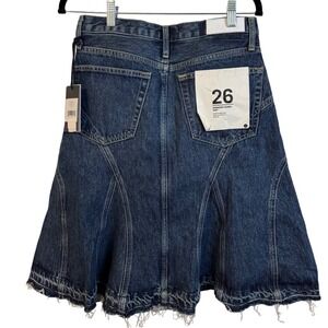 Keywords: RE/DONE skirt, denim skirt, engineered seam skirt, whiskey indigo, raw hem skirt, A-line skirt, mid-rise skirt, designer denim, women's skirt, casual skirt, cotton skirt, five pocket skirt, RE/DONE, new with tags