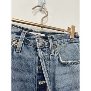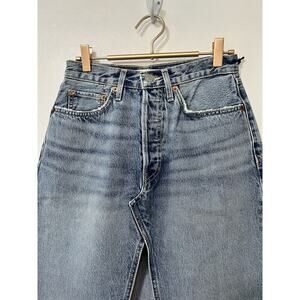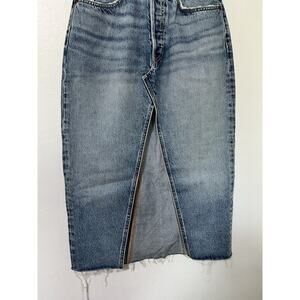 RE/DONE Denim Raw Hem Midi Skirt Size 26 Light Wash Opal Indigo Front Slit NWT