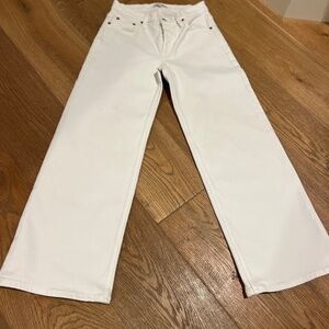 The White Mid Rise Wide Leg Crop features wide leg and clean hem. With comfort stretch denim and classic button fly. Pair with tanks, tees, or buttons downs for versatile styling.