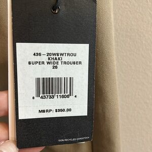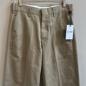 RE/DONE Super Wide Trouser Khaki NWT. 100% Cotton twill. High rise. Belt loops. 4 pocket styling. Zip fly. Size 26