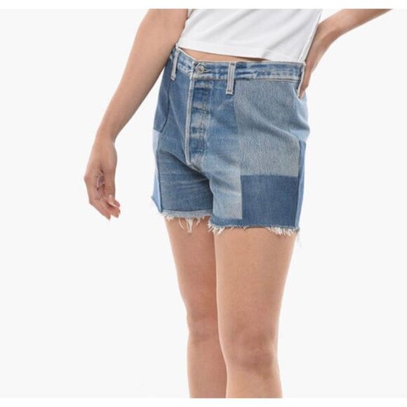 RE/DONE LEVI'S DENIM PATCHWORK SHORTS WITH FRAYED HEM Size 27