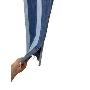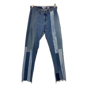 "The RE/DONE Levi's Patched Skinny Boot is patched with long strips of Levi's denim featuring a slit detail at inseam and patched back pockets."