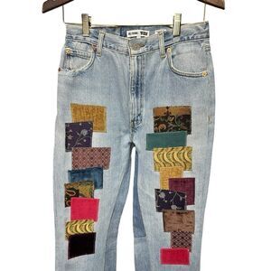 Features a zip fly, cropped length, slight kick flare, and unique tapestry patchwork throughout. This jean was upcycled locally in Los Angeles from preloved vintage denim.