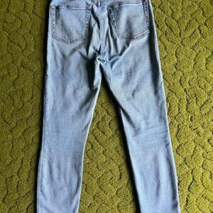 Self: 96% cotton, 2% poly, 1% elastan.Lining: 65% poly, 35% cotton. Button fly. 5-pocket design. Light whiskering along front. Faded throughout. 13" at the knee narrows to 10" at the leg opening. Made in Mexico.